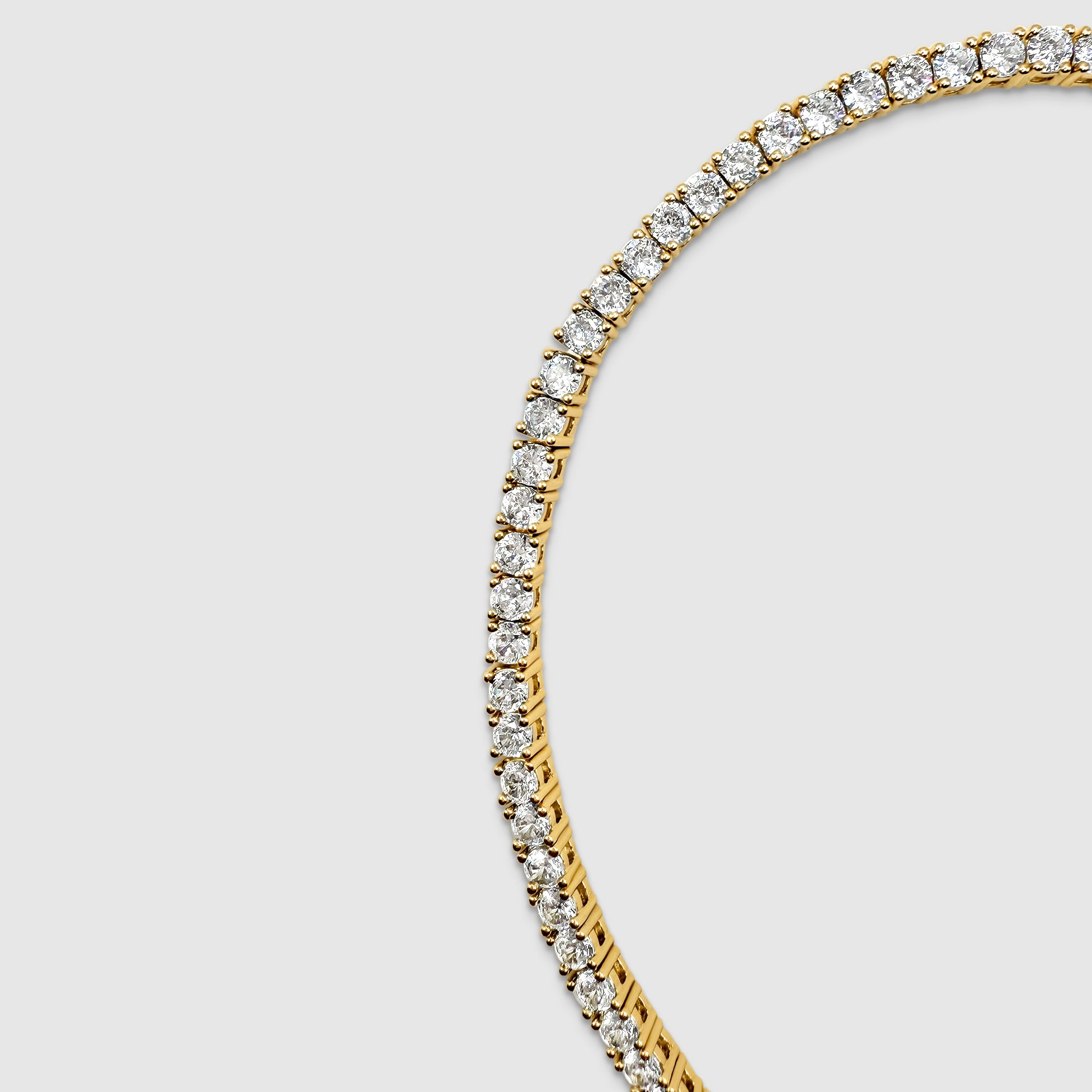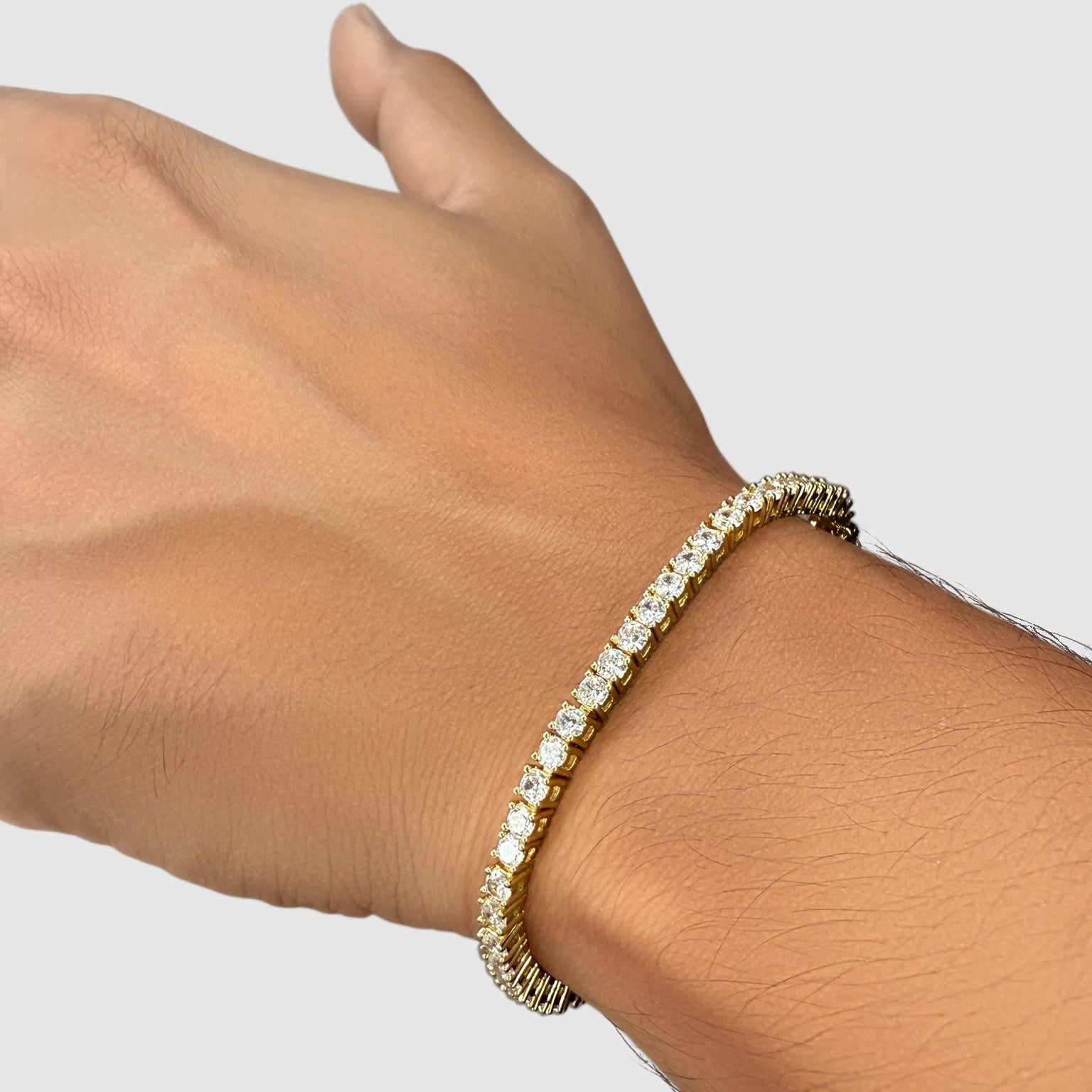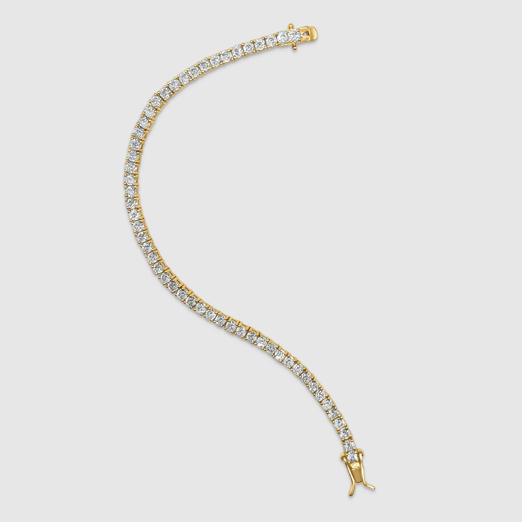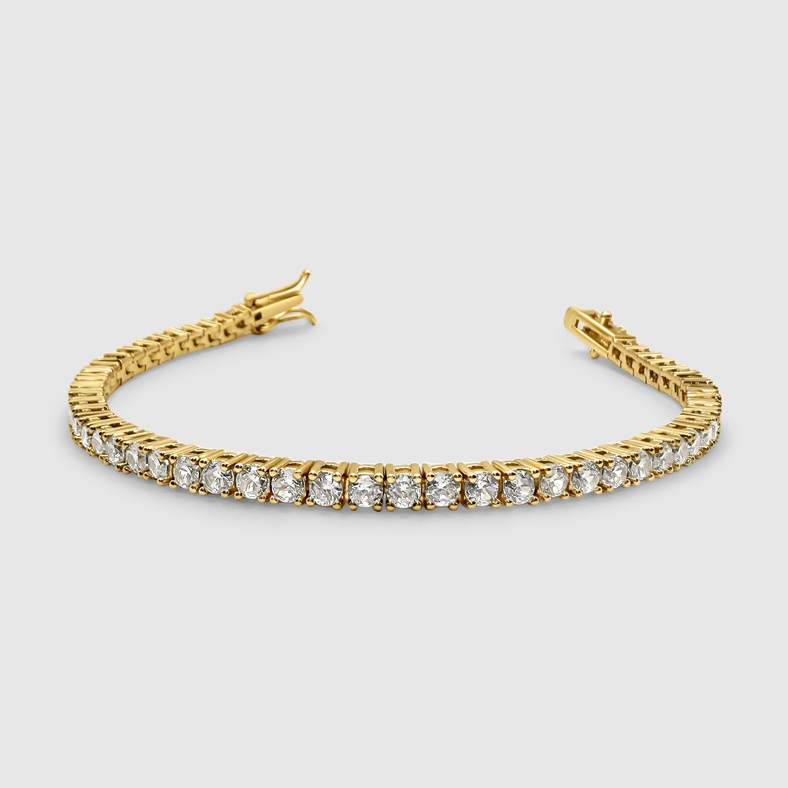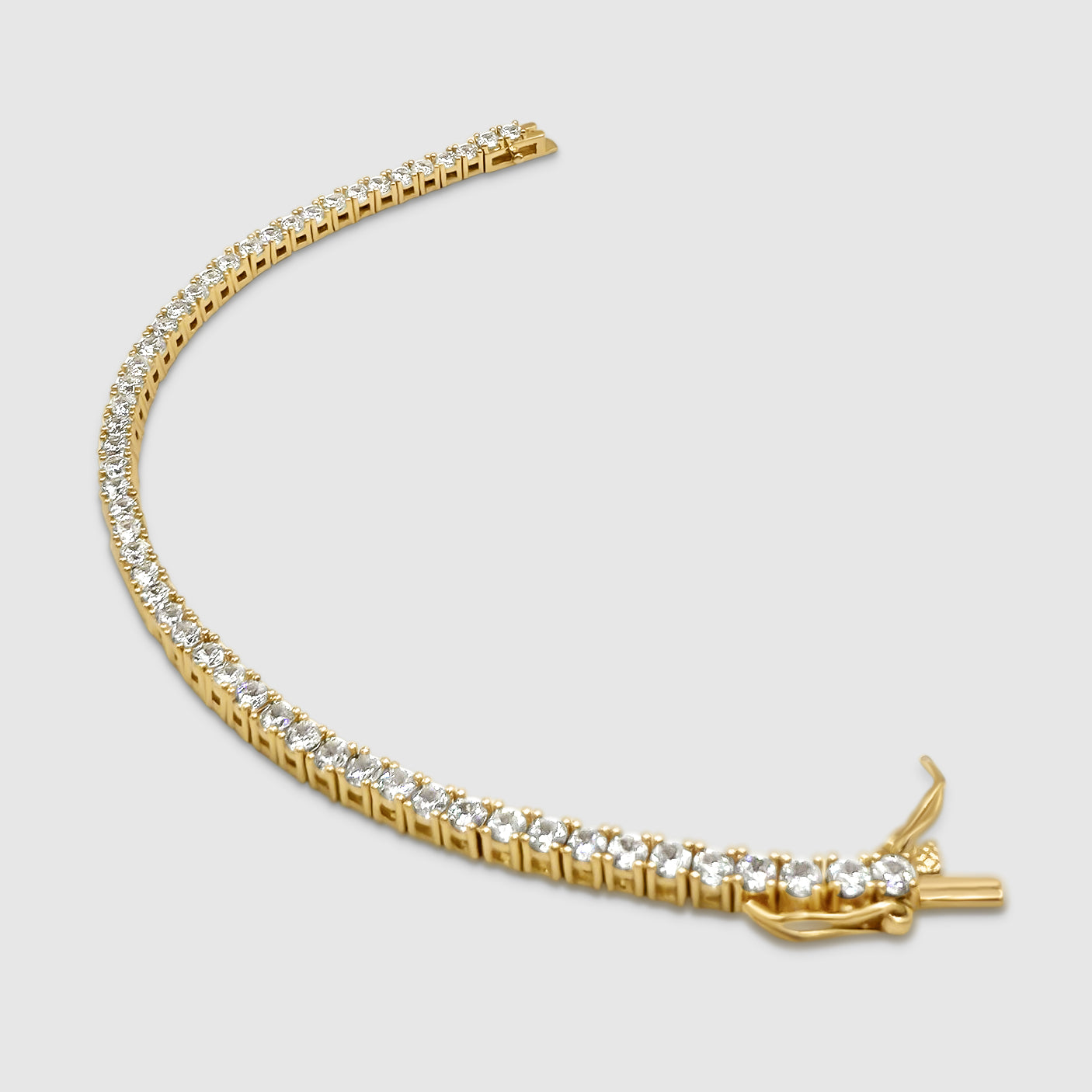 Its slim 3mm silhouette offers a refined profile, while the continuous line of high-grade diamond simulants adds a subtle, light-catching sparkle. Finished in rich 18K yellow gold, the bracelet brings a classic warmth that elevates both everyday looks and special moments.